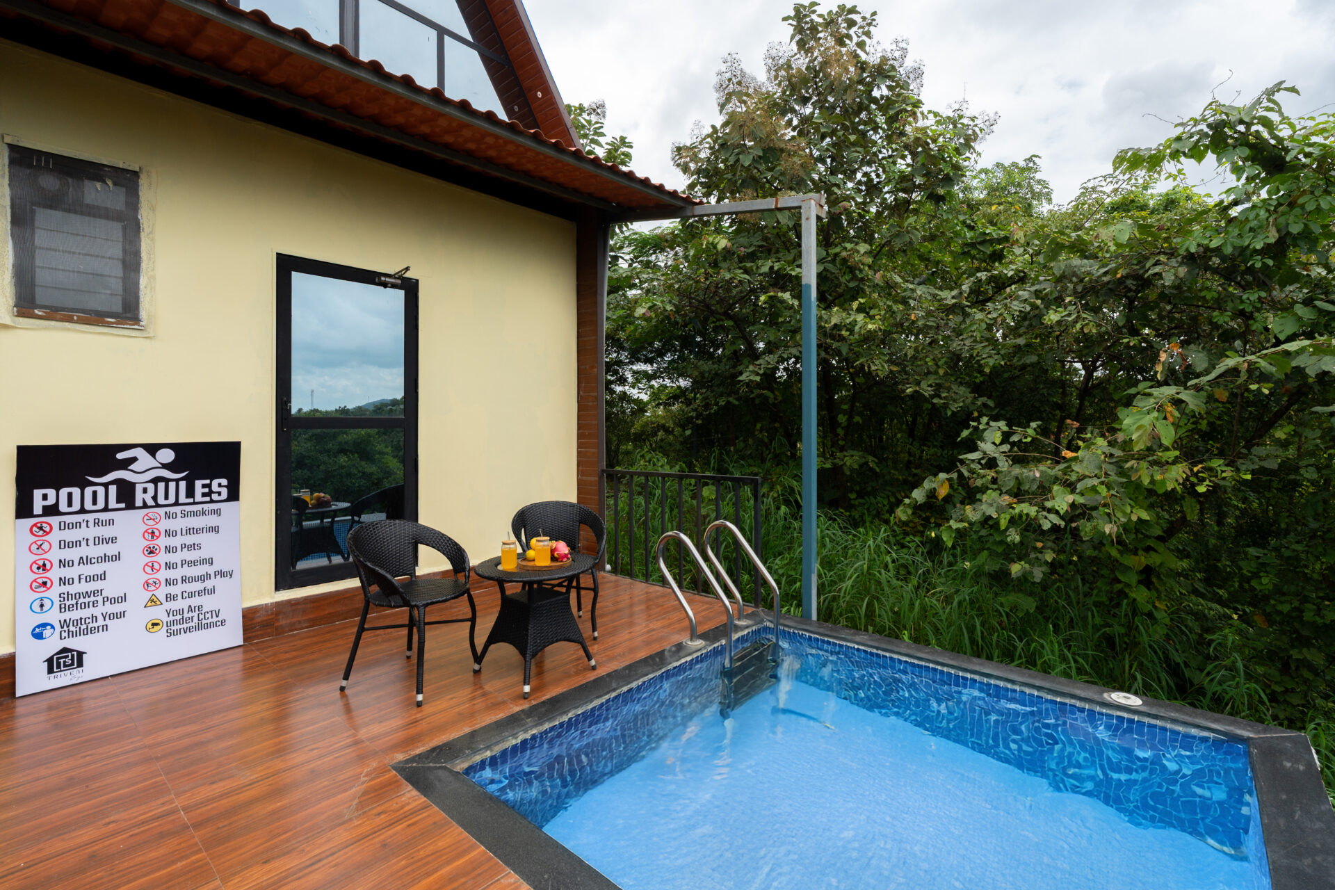 - Amenities: Air-conditioned, Board Games, Free wi-fi, Fridge, Geyser, Kitchen Utensils, LGBTQ+ Friendly, Microwave, Music System, Pet Friendly, Power Back-up, Smart TV, Swimming Pool, Toiletries, Under protection, Water Purifier